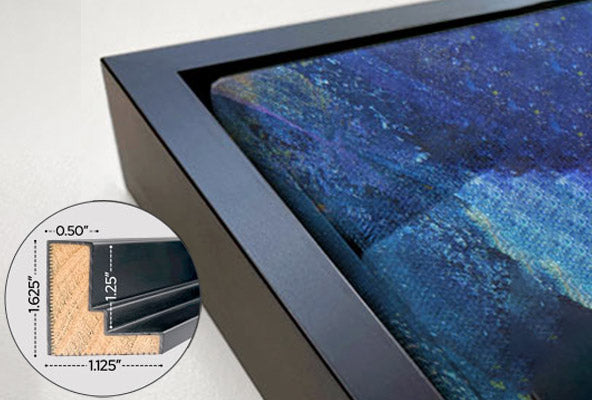 Floating Frames | Our floating frames are made of quality wood, offering the canvas print the illusion of floating inside the frame. Available float frame colors: black, natural oak, and walnut. NOTE: While the thickness of the frame wood is the same for all product sizes (0.50" Front W & 1.125 Back W x 1.625" D | See Image), the mockup photos may not reflect the ratio of wood thickness to canvas size.